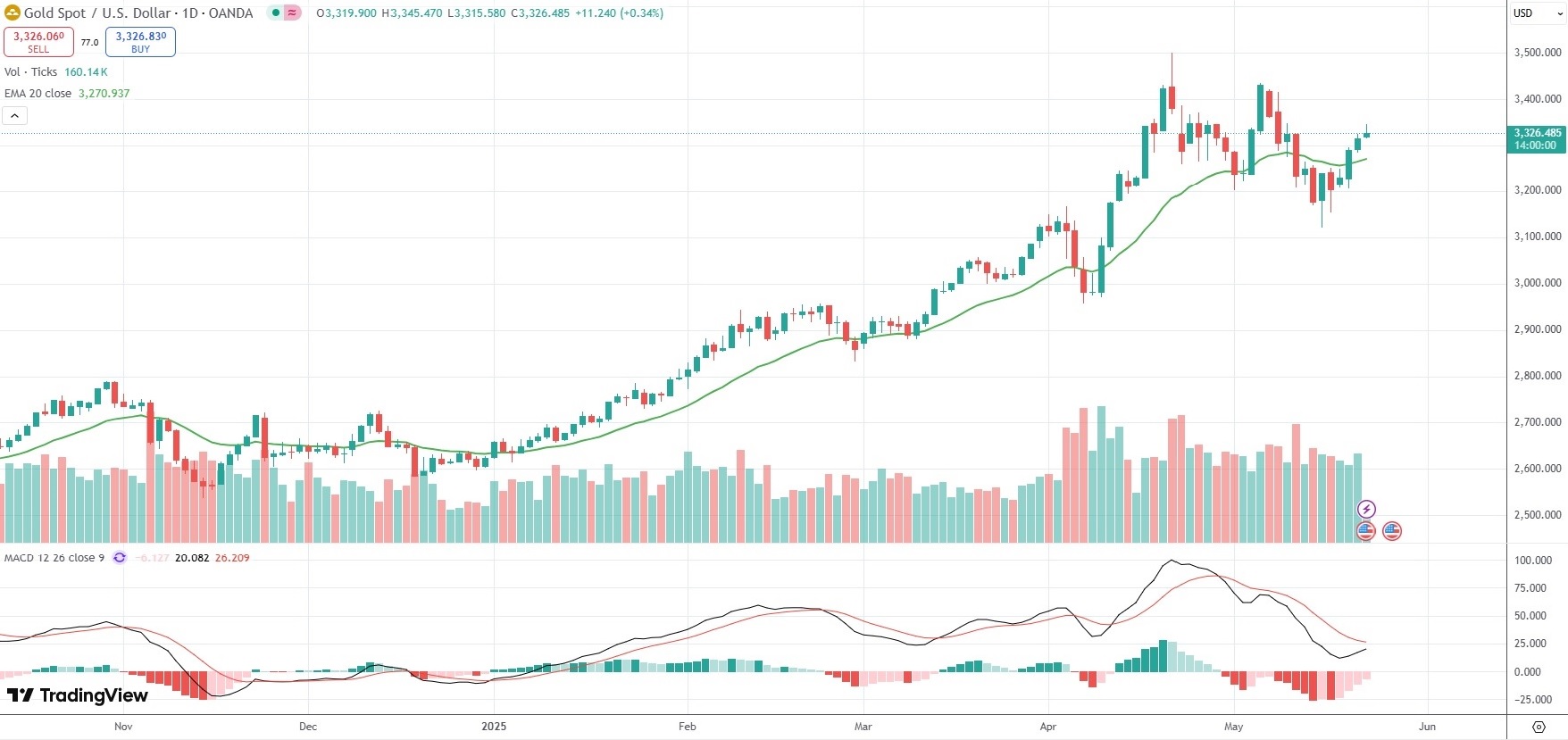 Spot Gold was last up 0.34% on the day to trade at $3,326.48 per troy ounce.