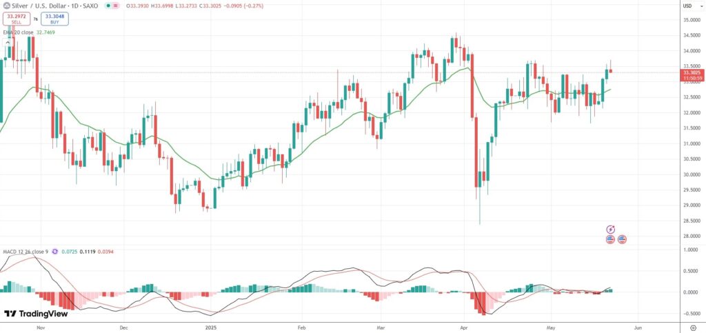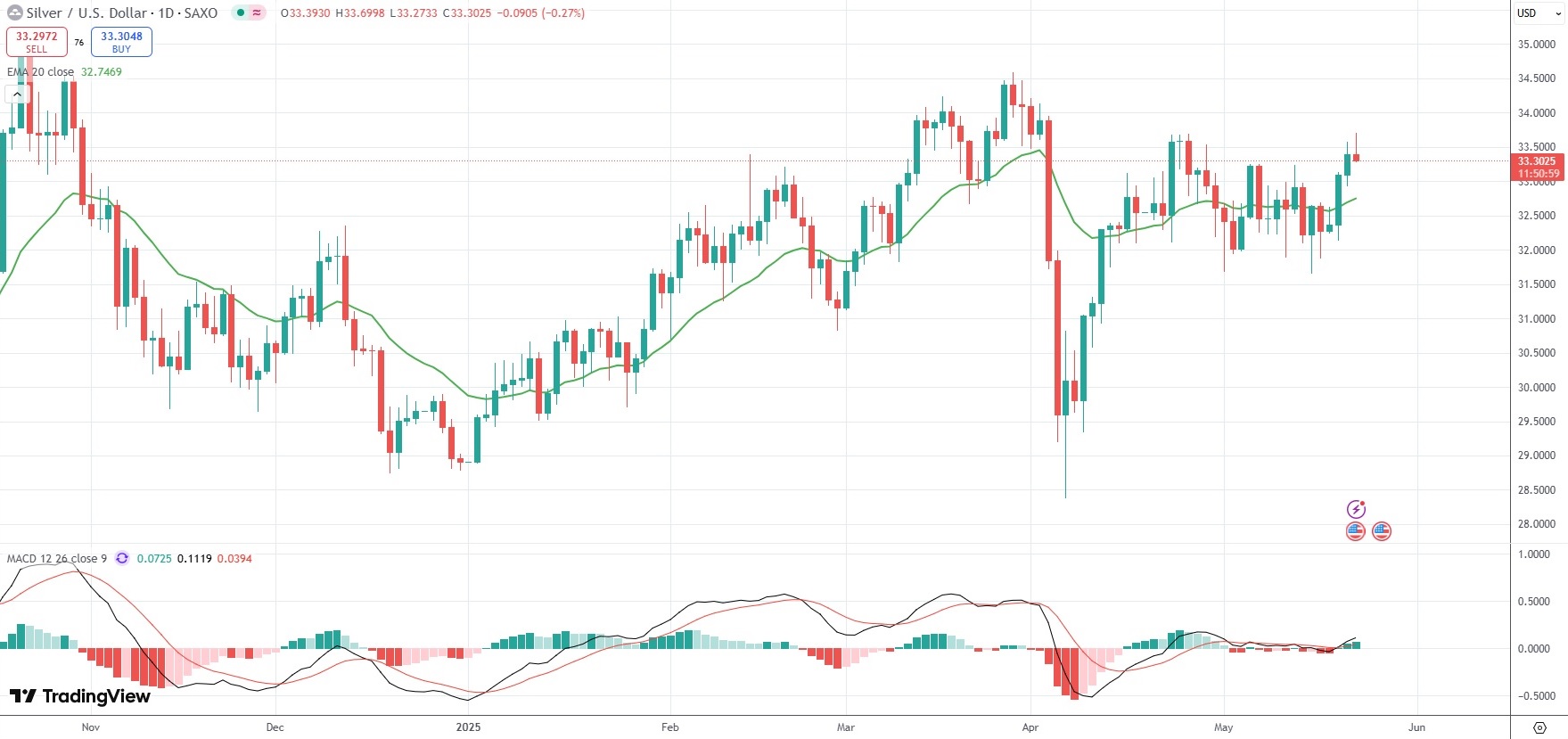 Spot Silver rose to a fresh 1-month high of $33.70 per troy ounce on Thursday, as investor concerns over US fiscal outlook mounted, pressuring the US Dollar and driving demand for safe-haven metals.