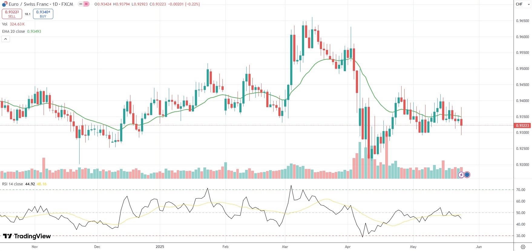 The EUR/CHF currency pair settled above Friday’s low of 0.9292, its weakest level since May 6th, after Euro Area’s negotiated wage growth slowed markedly in Q1, supporting the case for further ECB interest rate cuts.