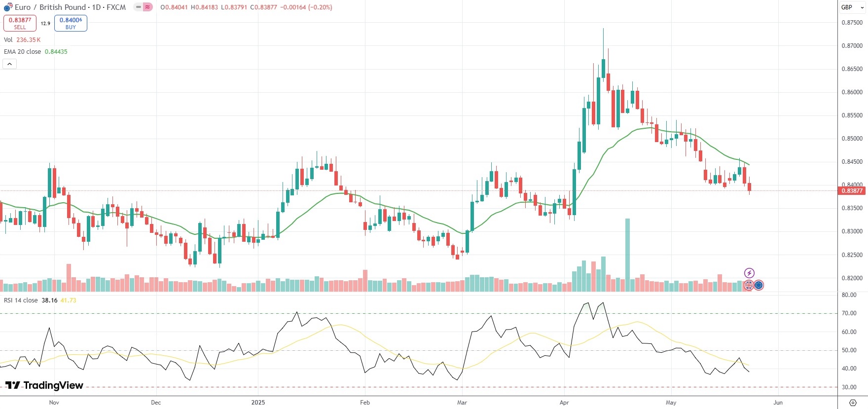 The EUR/GBP currency pair settled 0.20% lower at 0.8388 on Friday.