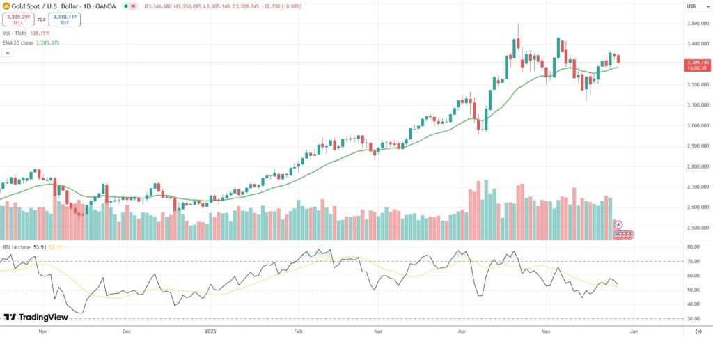 Spot Gold was last down 0.98% on the day to trade at $3,309.74 per troy ounce.