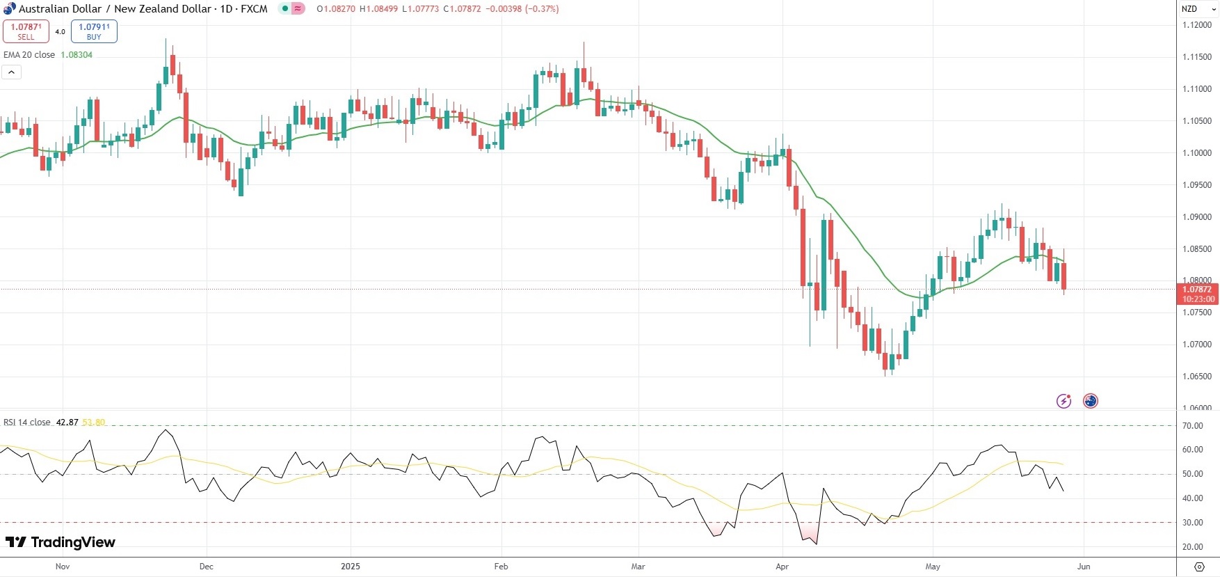 The AUD/NZD currency pair was last down 0.37% on the day to trade at 1.0787.