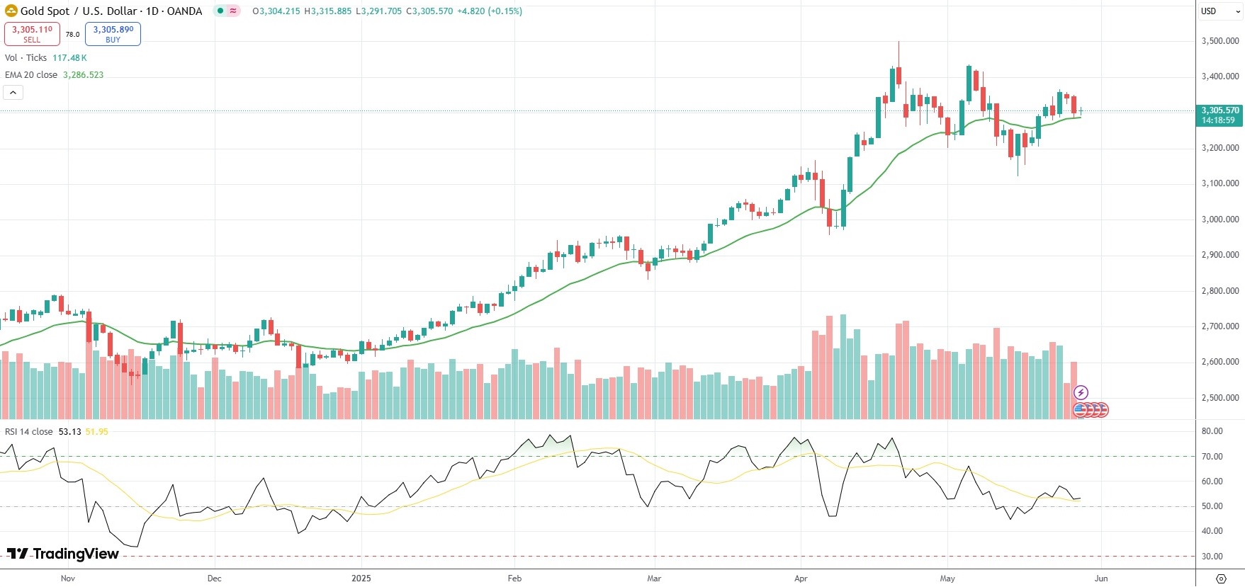 Spot Gold was last up 0.15% on the day to trade at $3,305.57 per troy ounce.