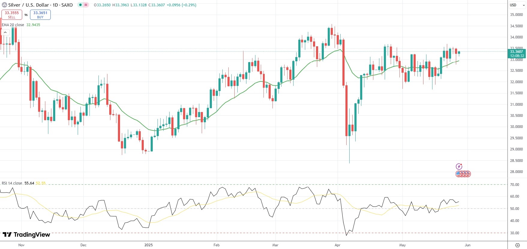 Spot Silver was last up 0.29% on the day to trade at $33.36 per troy ounce.