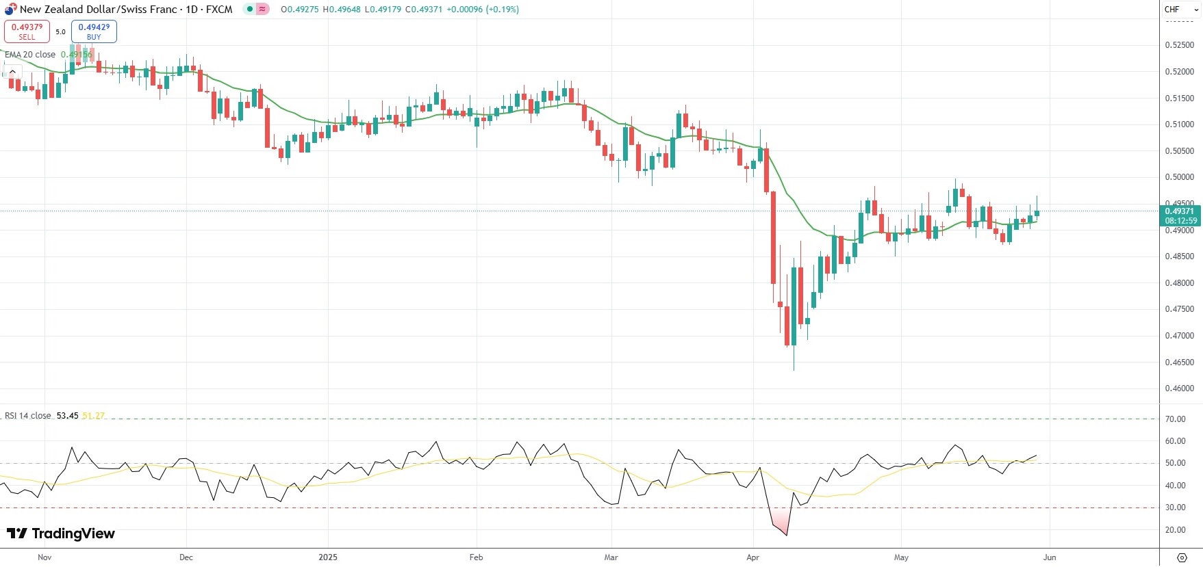 The NZD/CHF currency pair was last up 0.19% on the day to trade at 0.4937.
