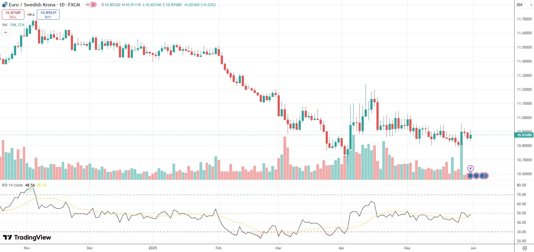 The EUR/SEK currency pair settled 0.22% higher at 10.8768 on Friday.