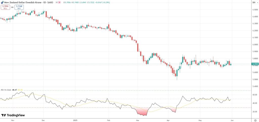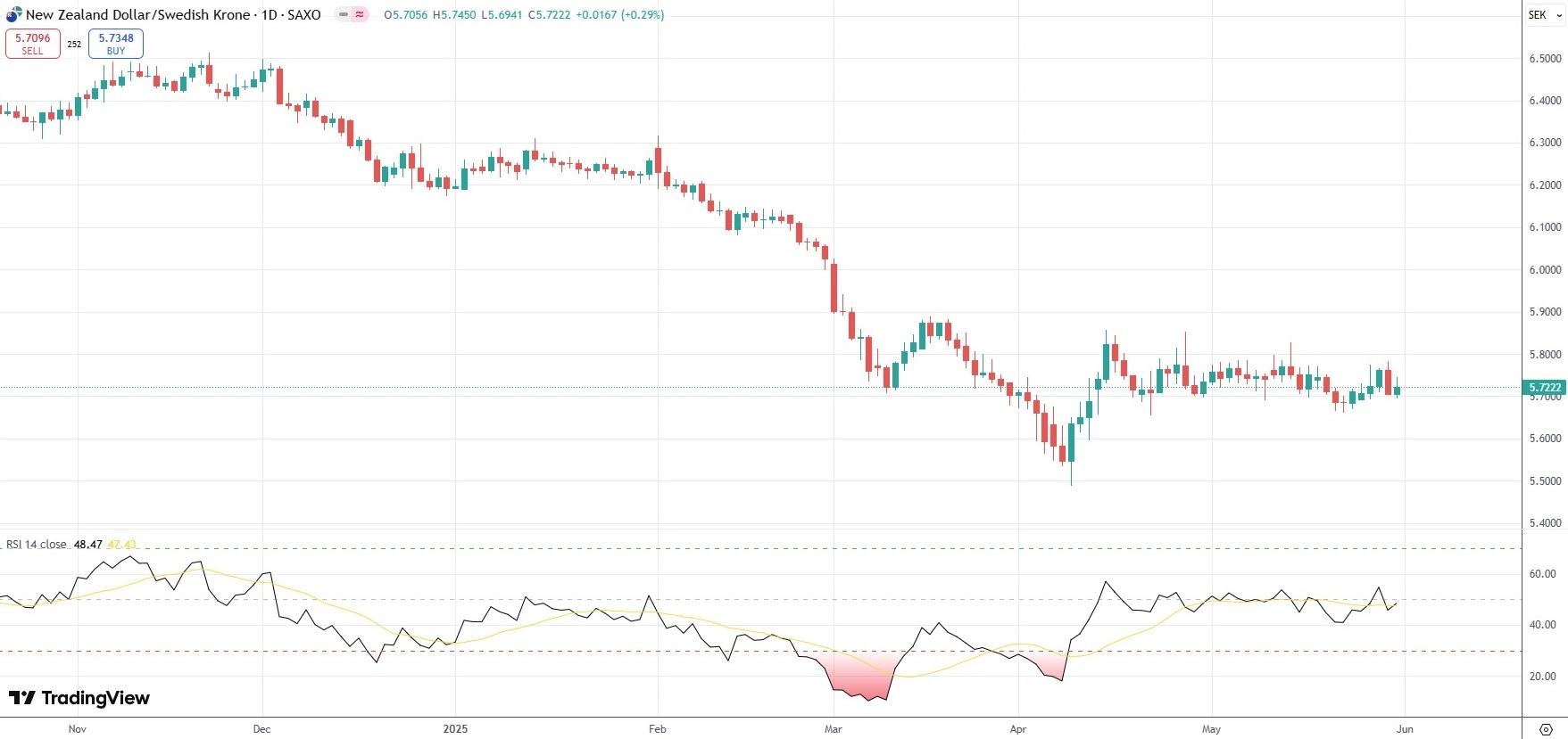 The NZD/SEK currency pair settled 0.29% higher at 5.7222 on Friday.