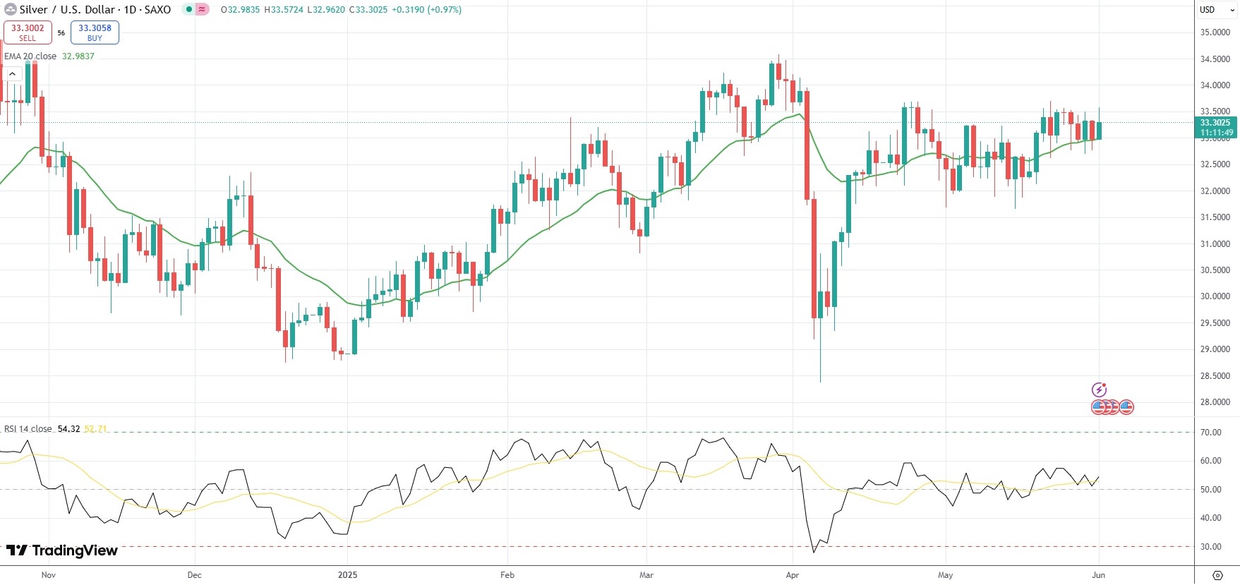Spot Silver was last up 0.97% on the day to trade at $33.30 per troy ounce.