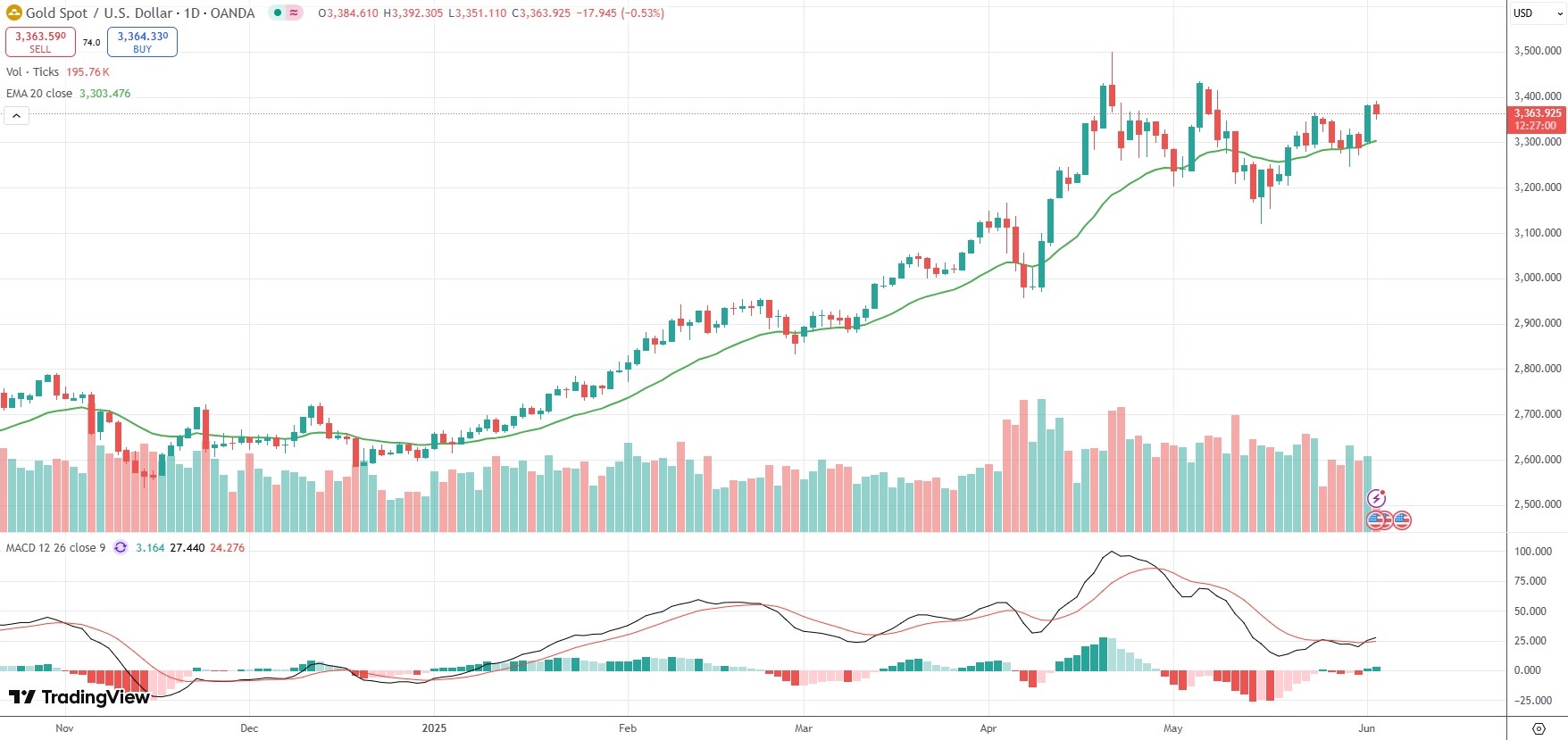 Spot Gold was last down 0.53% on the day to trade at $3,363.92 per troy ounce.