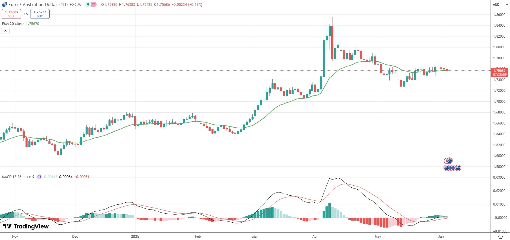 The EUR/AUD currency pair was last down 0.13% on the day to trade at 1.7568.
