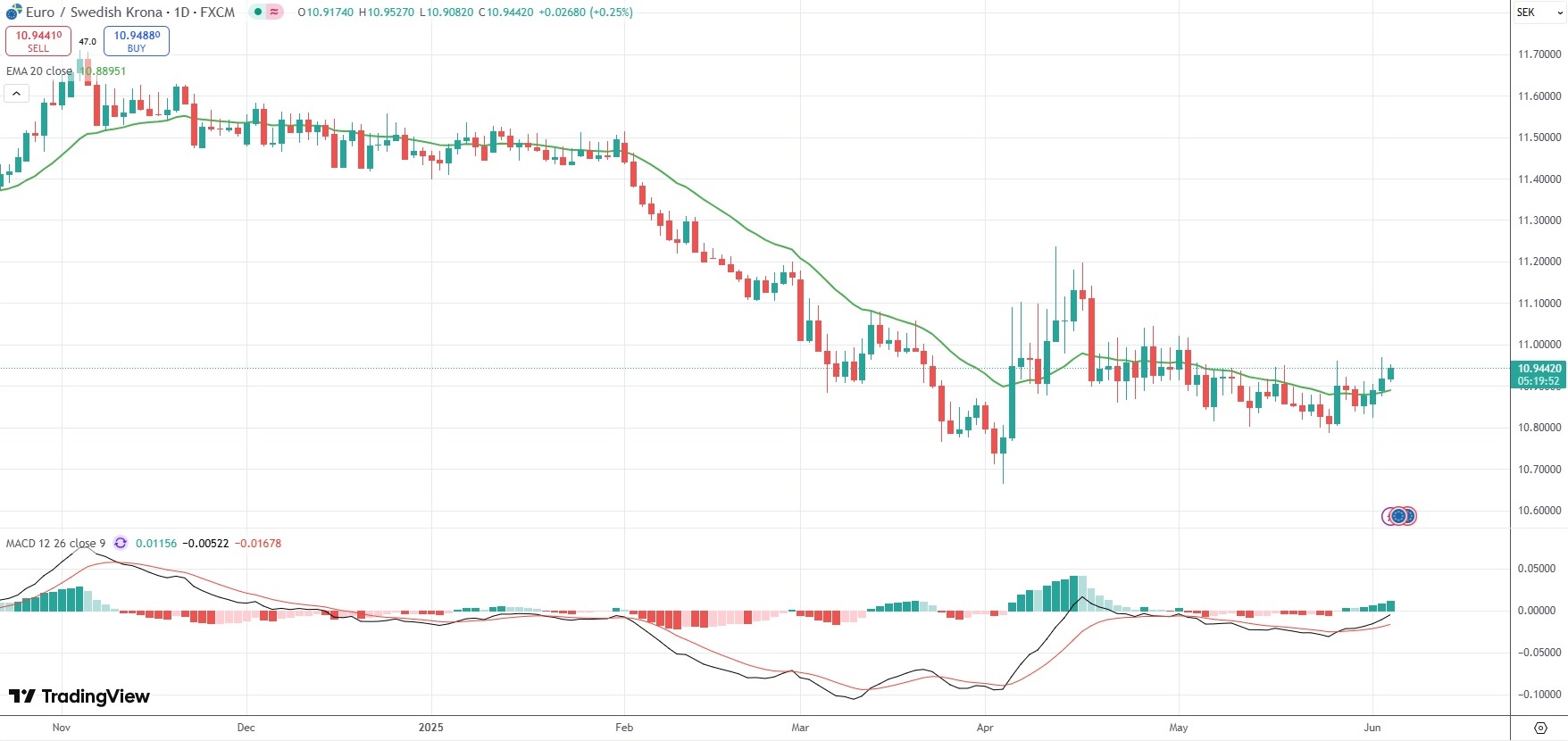 The EUR/SEK currency pair was last up 0.25% on the day to trade at 10.9442.