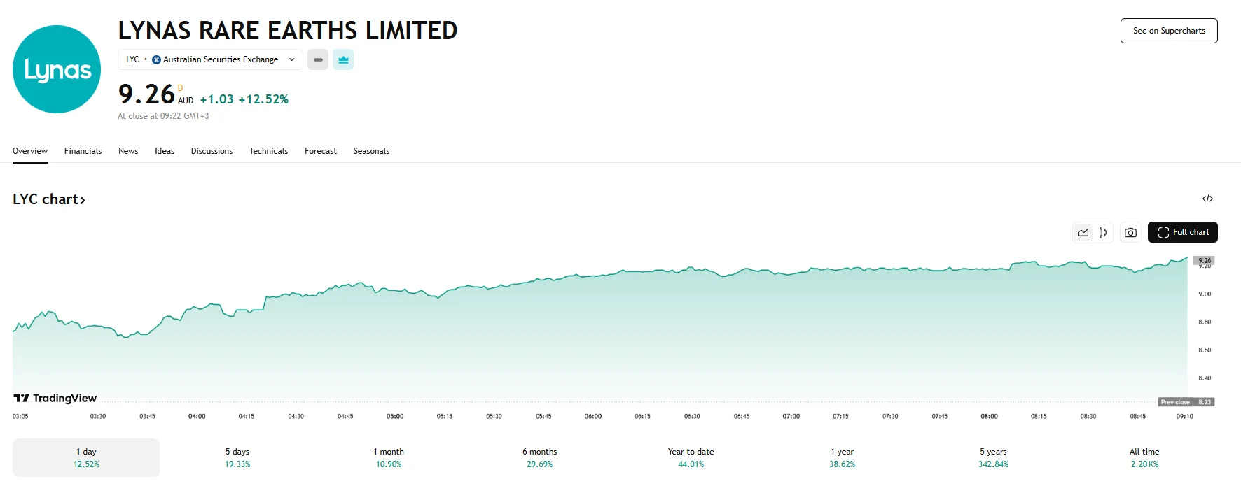 - Lynas Rare Earths surged 12.52% to A$9.26 on Thursday, its highest price in several years.