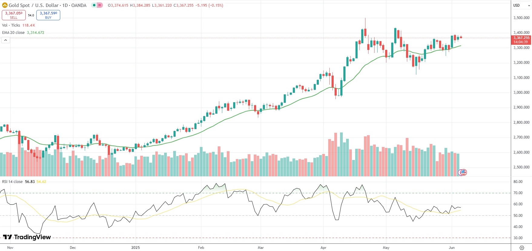 Spot Gold was last down 0.15% on the day to trade at $3,367.25 per troy ounce.