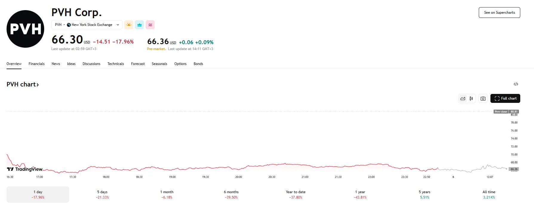 PVH Corp. saw its stock plummet by the time markets closed on Thursday, with its price sinking 18% to end the session at $66.30. The stock shows little signs of recovery during Friday’s pre-market hours and remains below $66.60 at press time.