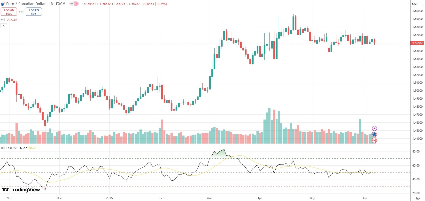 The EUR/CAD currency pair settled 0.29% lower at 1.5598 on Friday.