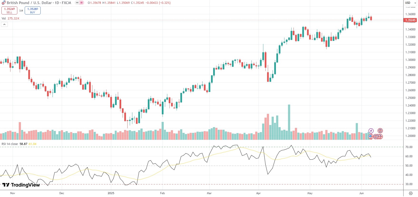 The GBP/USD currency pair settled below recent high of 1.3616, its strongest level since February 23rd 2022, as US job market resilience tempered Fed rate cut expectations.