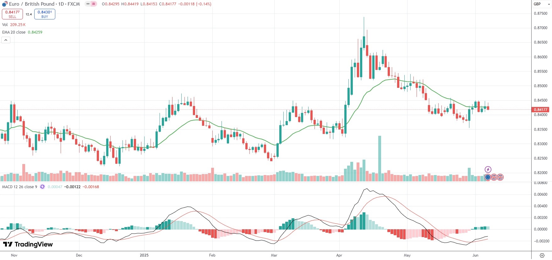 The EUR/GBP currency pair settled 0.14% lower at 0.8417 on Friday.