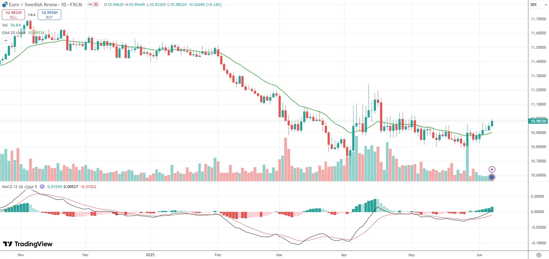 The EUR/SEK currency pair settled 0.34% higher at 10.9832 on Friday.