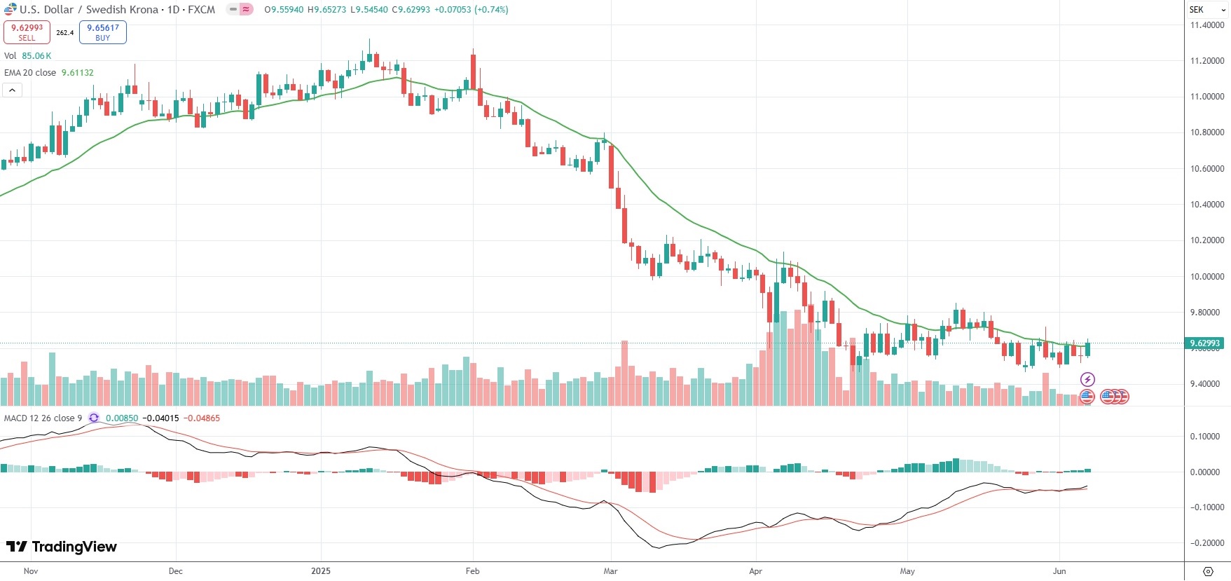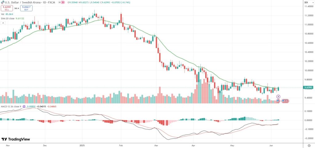 The USD/SEK currency pair settled below Friday’s high of 9.6527, its strongest level since May 29th, as US job market resilience tempered Fed rate cut expectations.