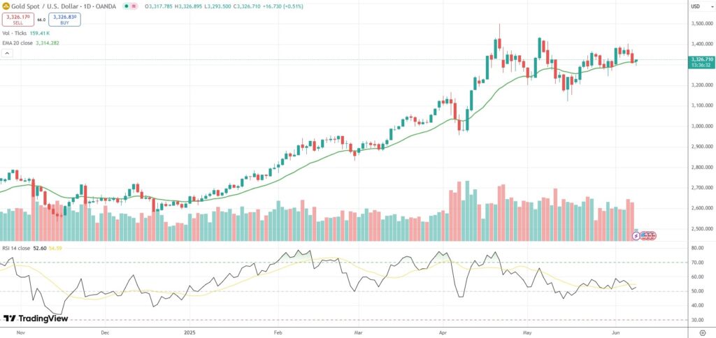 Spot Gold was last up 0.51% on the day to trade at $3,326.71 per troy ounce.