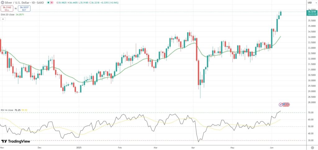 Spot Silver was last up 0.94% on the day to trade at $36.32 per troy ounce.
