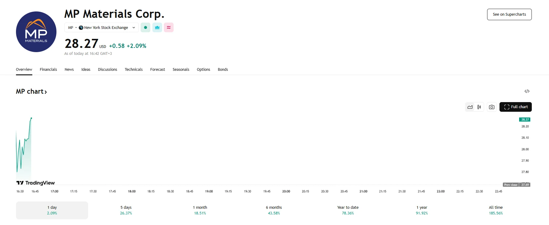 - MP Materials shares closed 7.7% higher at $27.69 on Monday and advanced further to $28.27 on Tuesday.