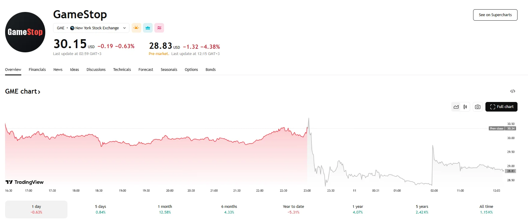 - GameStop shares declined over 4% during pre-market trading on Wednesday.