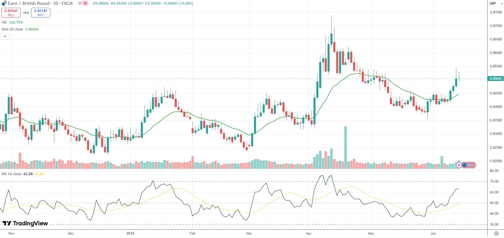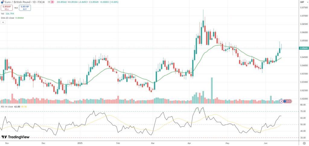 The EUR/GBP currency pair settled below recent high of 0.8546, its strongest level since April 25th.
