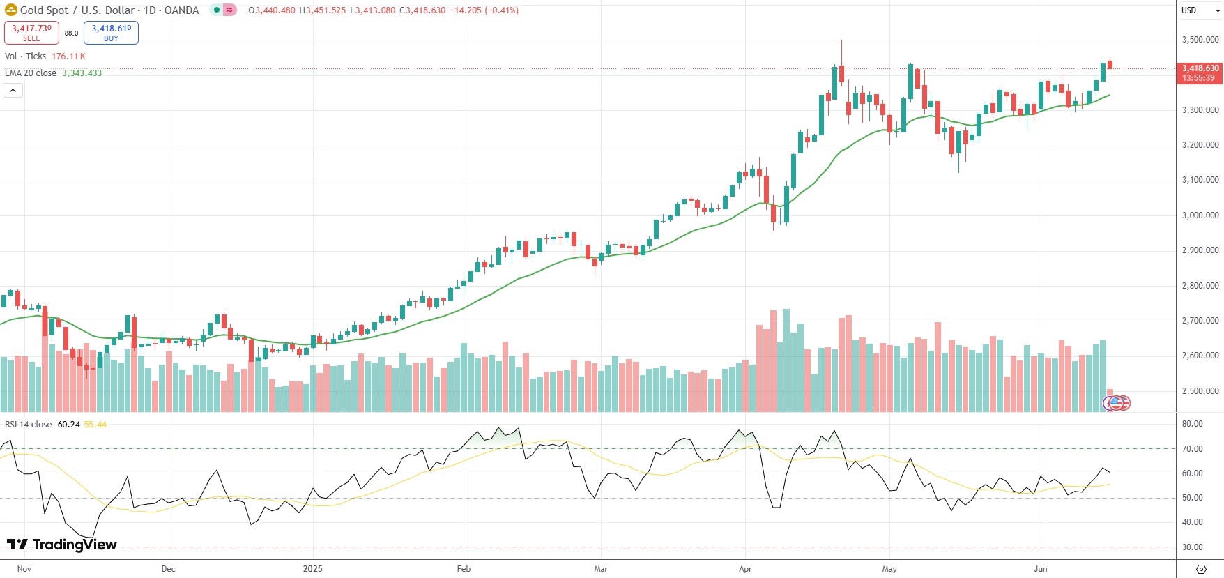Spot Gold was last down 0.41% on the day to trade at $3,418.63 per troy ounce.