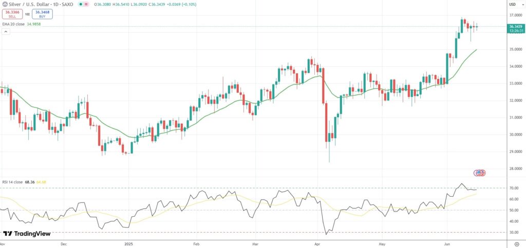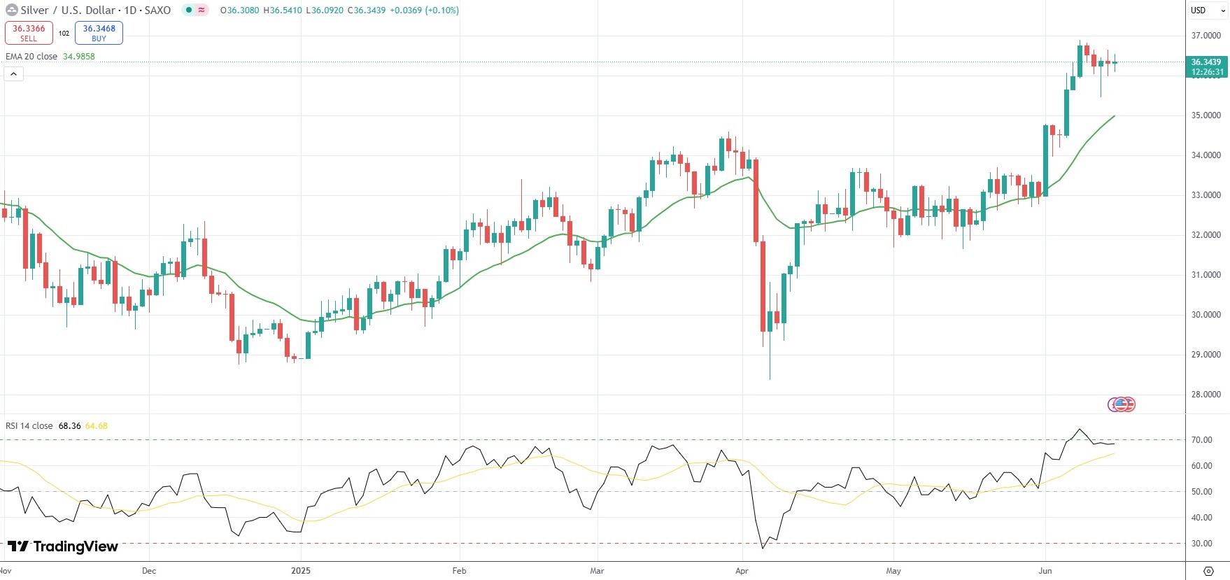 Spot Silver held not far from a 13-year high of $36.88 on Monday, as escalating conflict between Israel and Iran over the weekend fueled concerns over a broader regional confrontation, while supporting safe-haven demand.
