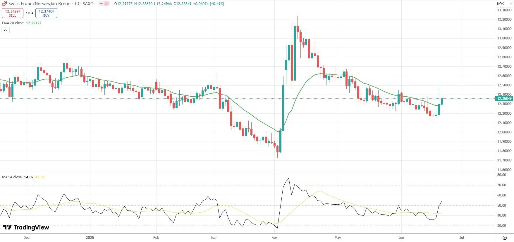 The CHF/NOK currency pair settled 0.49% higher at 12.3585 on Friday.