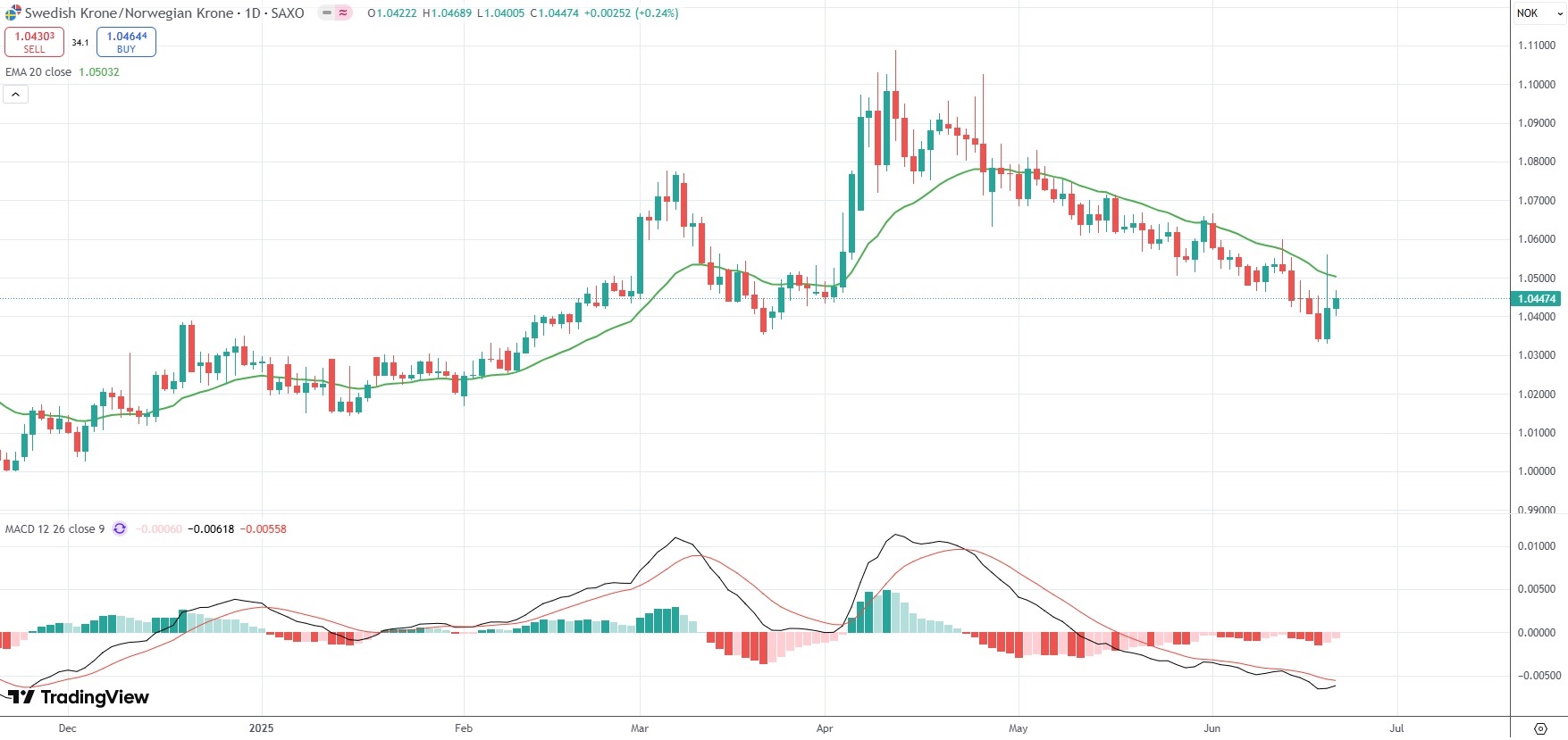 The SEK/NOK currency pair settled 0.24% higher at 1.0447 on Friday.
