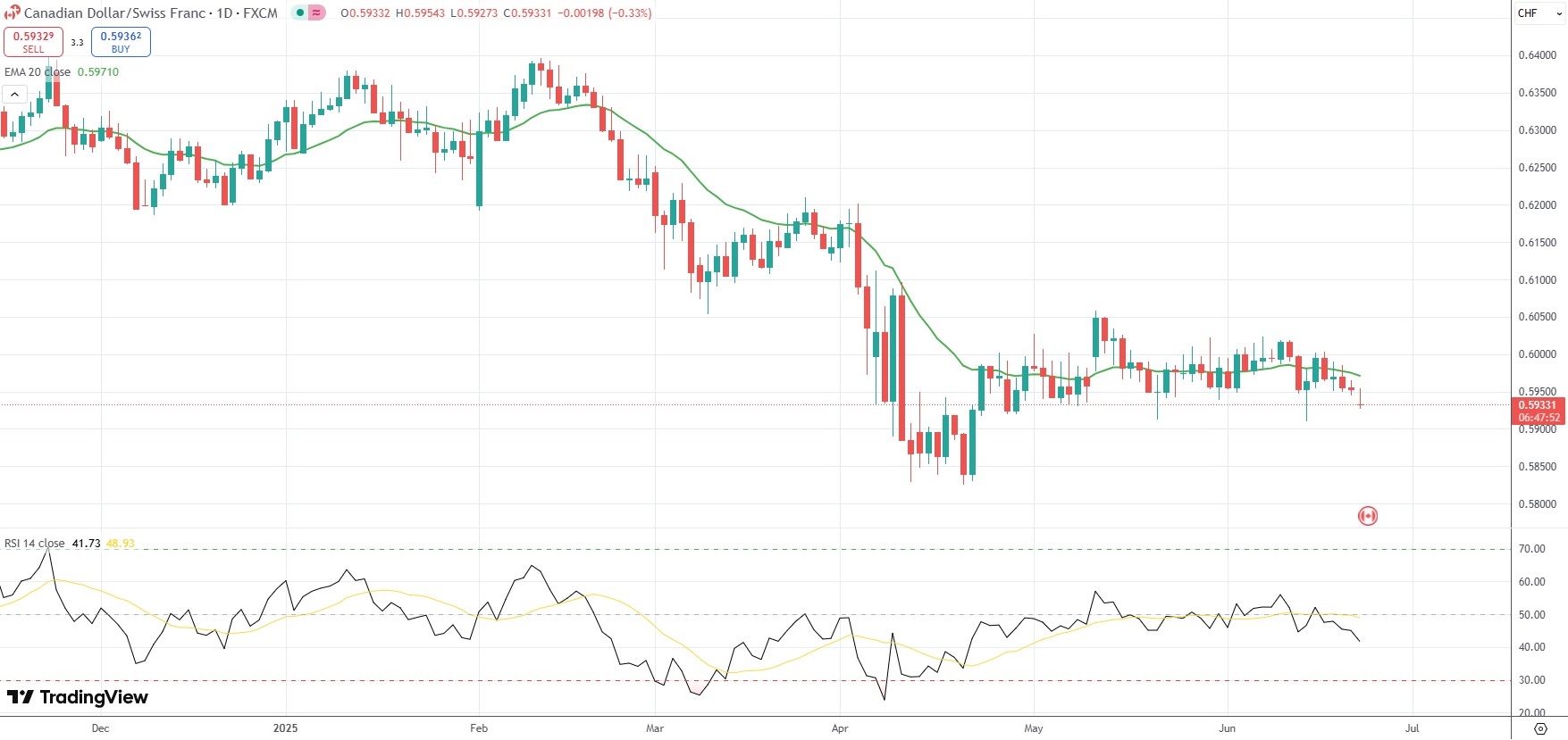 The CAD/CHF currency pair hovered just above a 1-week low of 0.5927 on Monday, as the escalating conflict in the Middle East in the wake of the US strike on crucial Iranian nuclear facilities over the weekend spurred demand for safe-haven currencies such as the Swiss Franc.