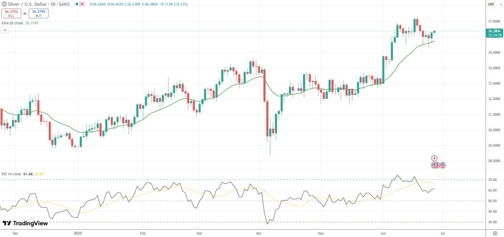 Spot Silver held near a 1-week high of $36.42 per troy ounce on Thursday, supported by a weaker dollar and lower Treasury yields.