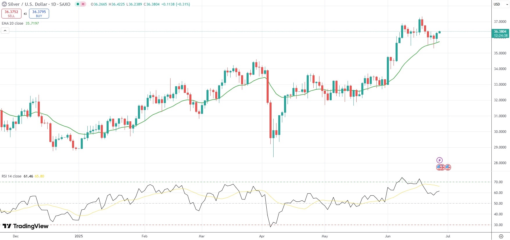 Spot Silver was last up 0.31% on the day to trade at $36.38 per troy ounce.