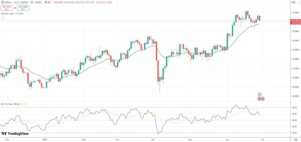 Spot Silver pulled back from a 1-week high of $36.84 per troy ounce on Friday, pressured by stronger-than-anticipated US macro data, which dampened Fed rate cut expectations.
