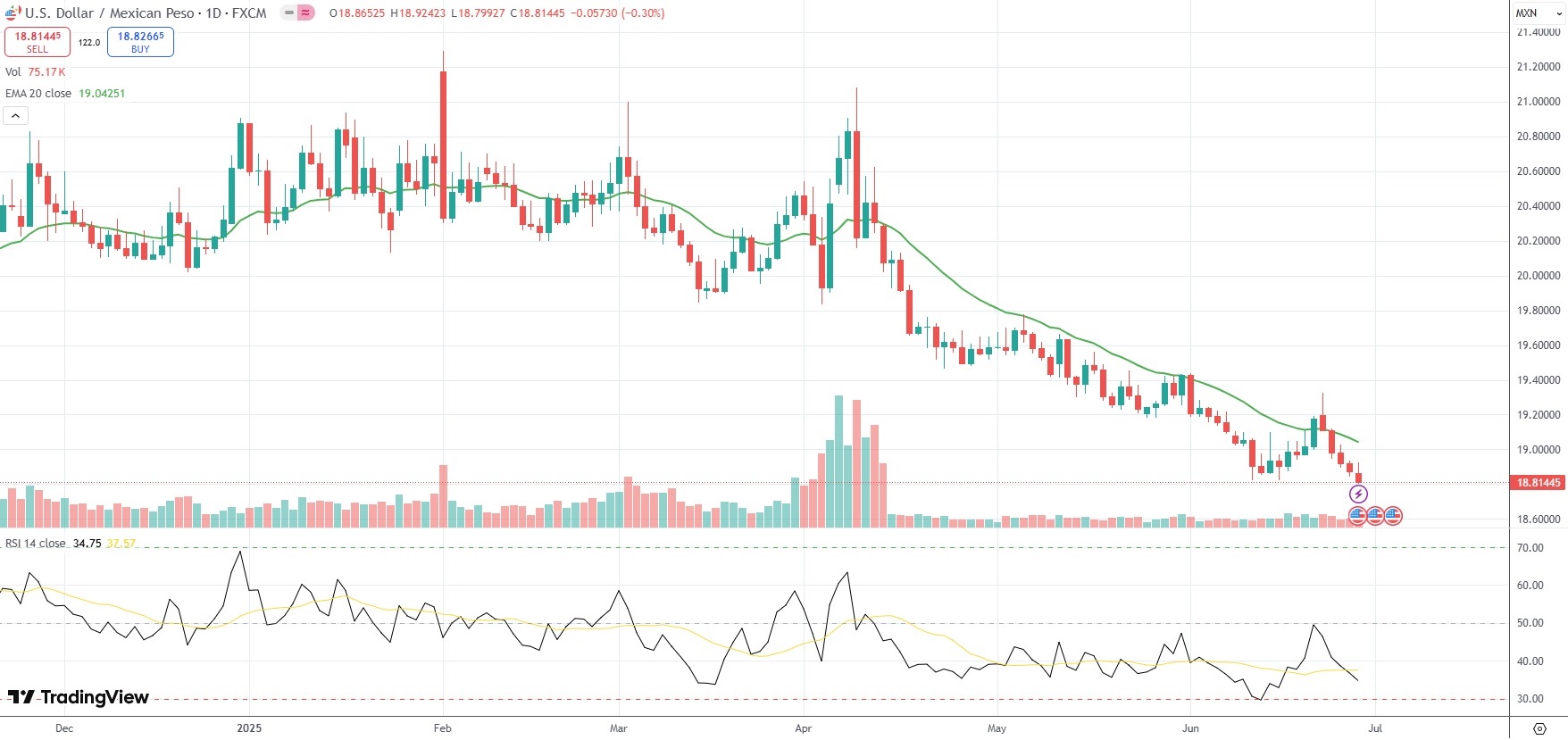 The USD/MXN currency pair settled 0.30% lower at 18.8144 on Friday.