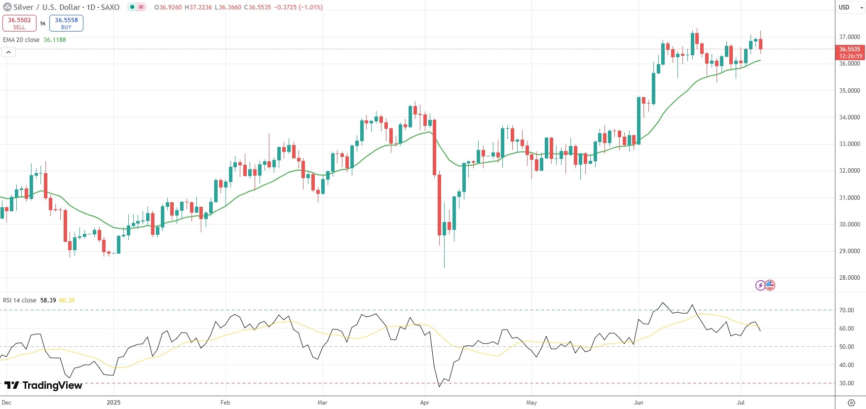 Spot Silver plunged over 1% on Monday, as the US indicated progress on a number of trade agreements and announced extended tariff reprieve for several countries. These developments weighed on traditional safe-haven assets.