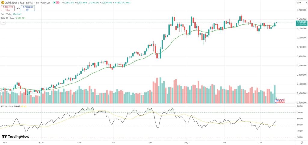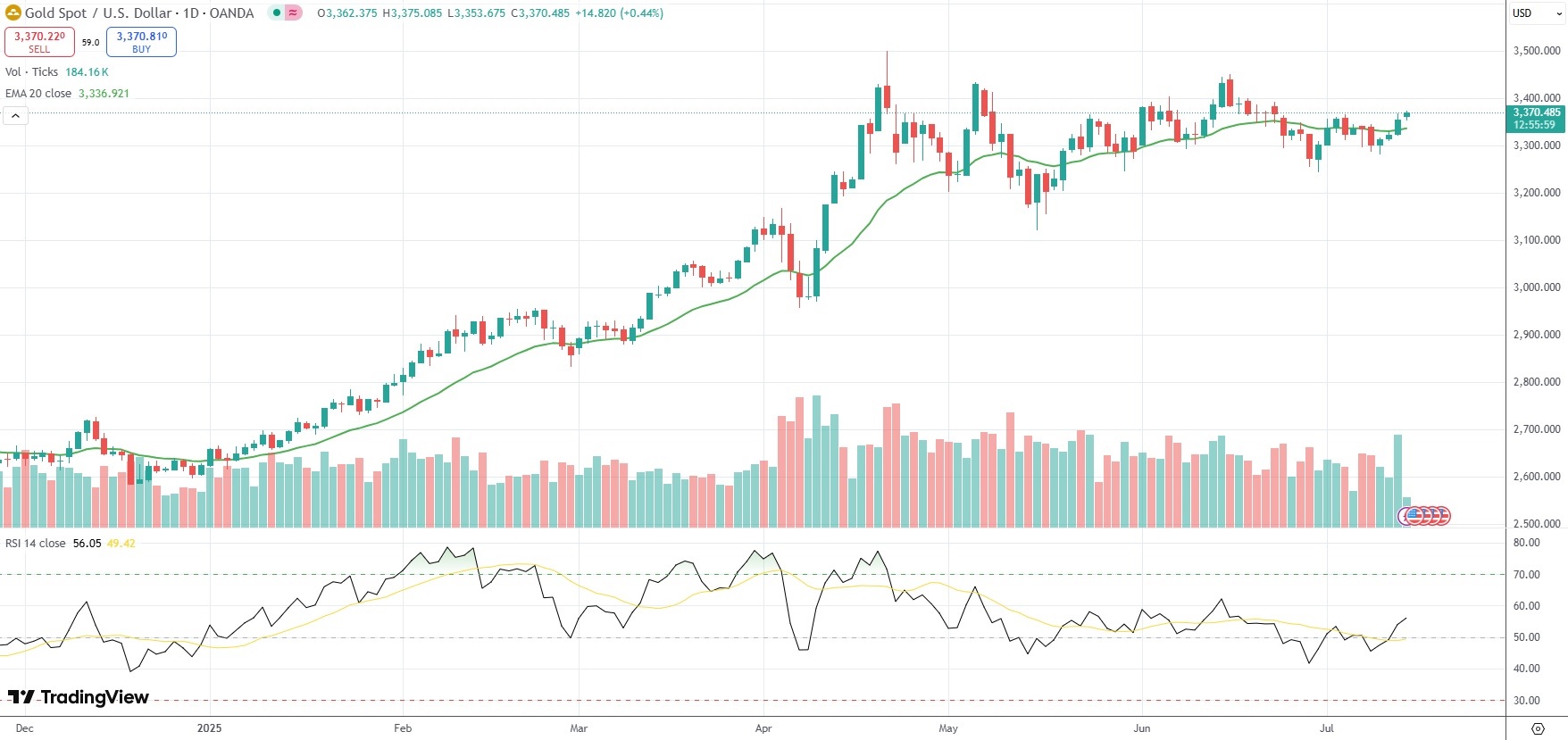 Spot Gold was last up 0.44% on the day to trade at $3,370.48 per troy ounce.