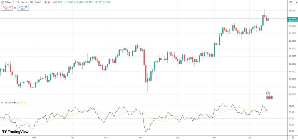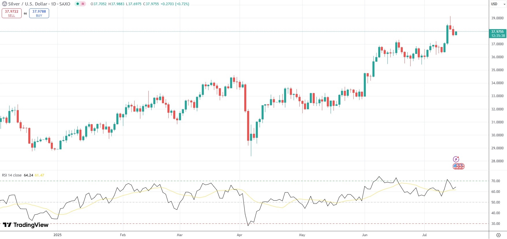 Spot Silver was last up 0.72% on the day to trade at $37.97 per troy ounce.
