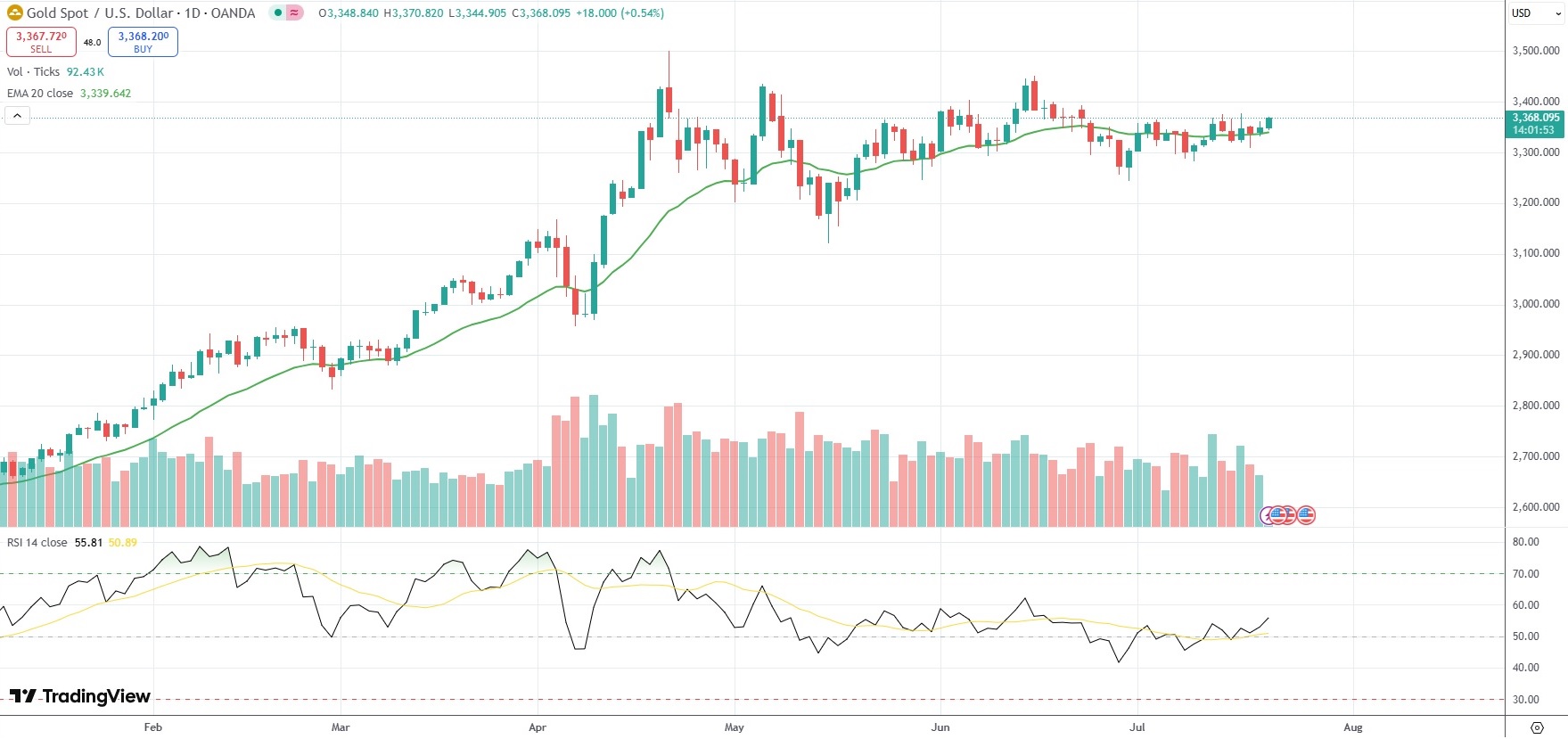 Spot Gold was last up 0.54% on the day to trade at $3,368.09 per troy ounce.