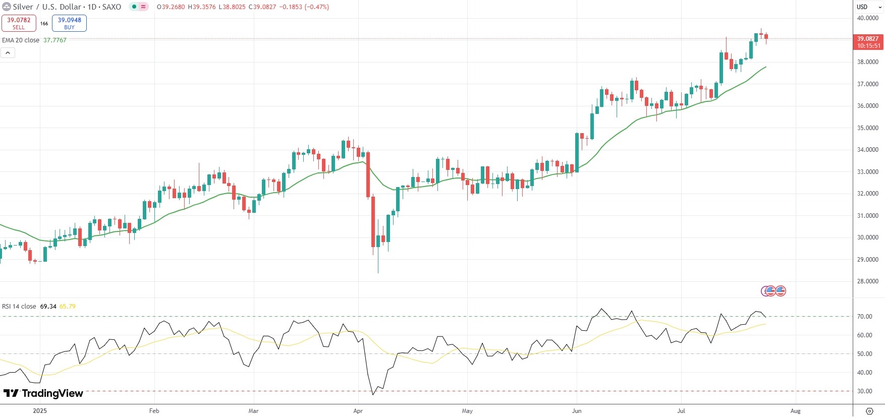 Spot Silver was last down 0.47% on the day to trade at $39.08 per troy ounce.