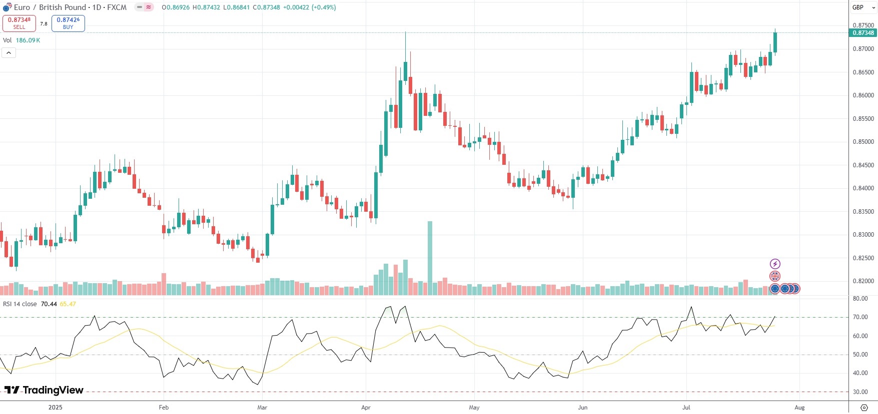 The EUR/GBP currency pair settled 0.49% higher at 0.8735 on Friday.