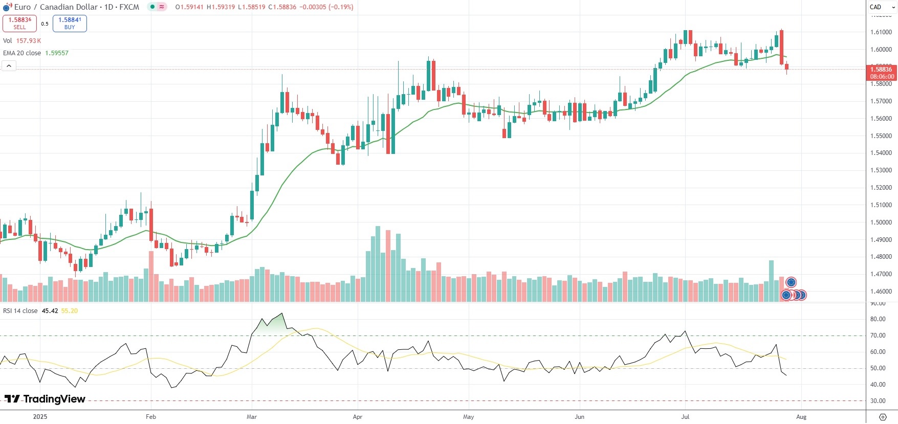 The EUR/CAD currency pair hovered above a fresh 1-month low of 1.5852 on Tuesday, as market players realized the trade deal between the US and the EU was an unbalanced one, favoring the United States and offering little to improve the Euro Area’s economic outlook.