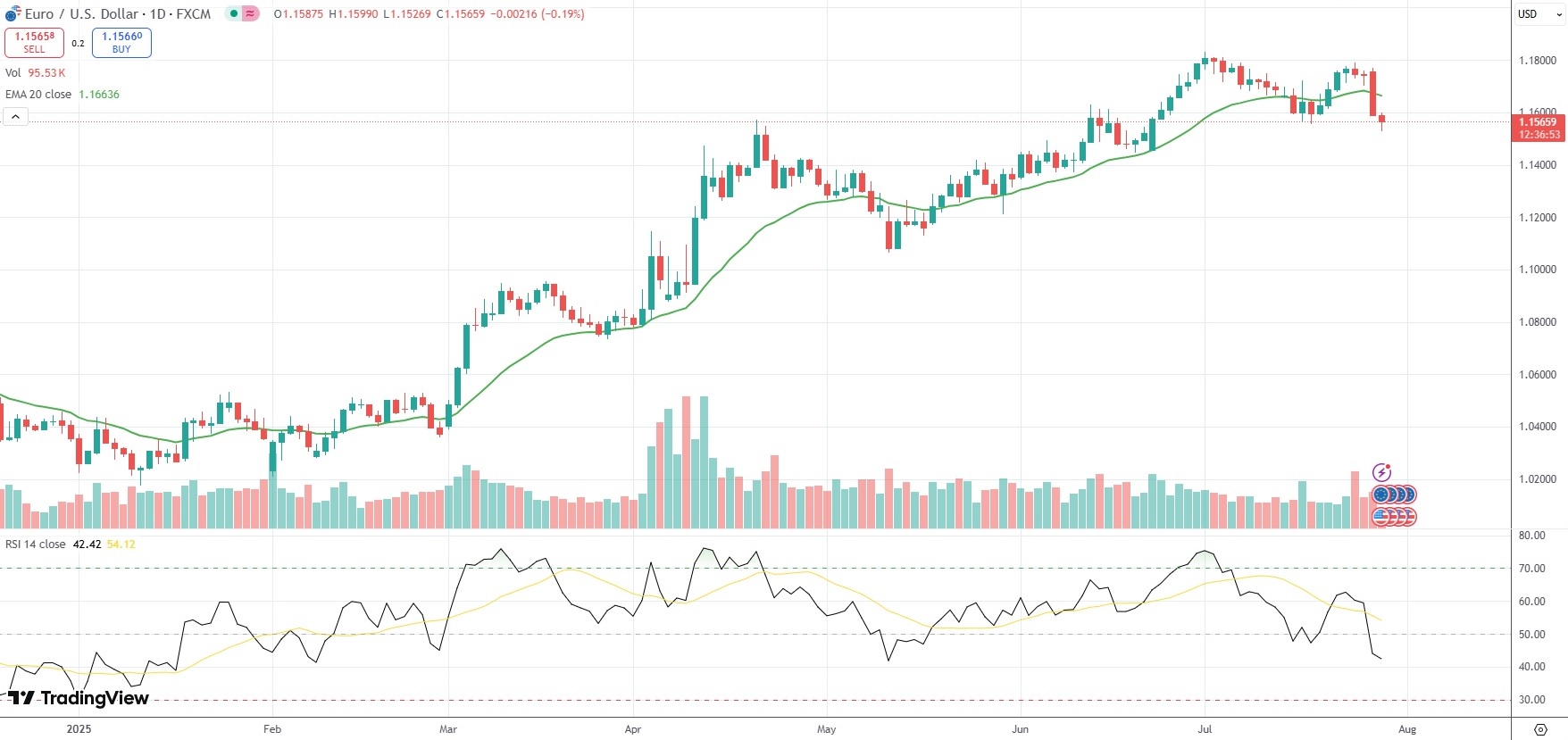 The EUR/USD currency pair extended losses, plumbing a fresh 1-month low of 1.1527 on Tuesday, as market players realized the trade deal between the US and the EU was an unbalanced one, favoring the United States and offering little to improve the Euro Area’s economic outlook.