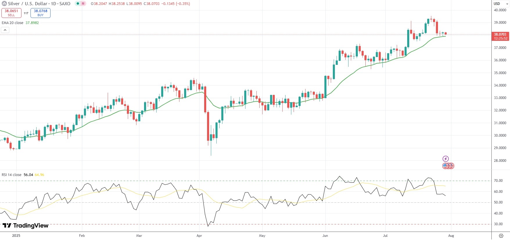 Spot Silver was last down 0.35% on the day to trade at $38.07 per troy ounce.