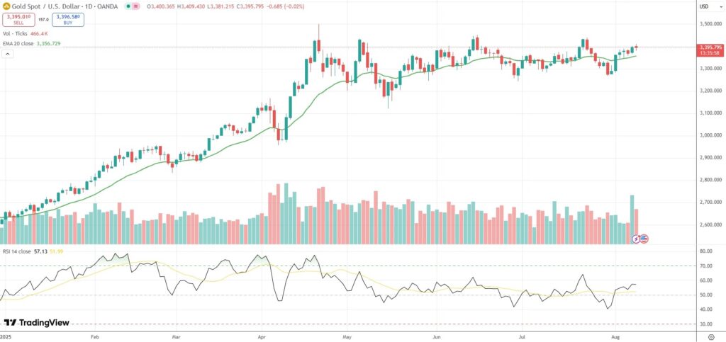 Spot Gold was last little changed on the day to trade at $3,395.79 per troy ounce.