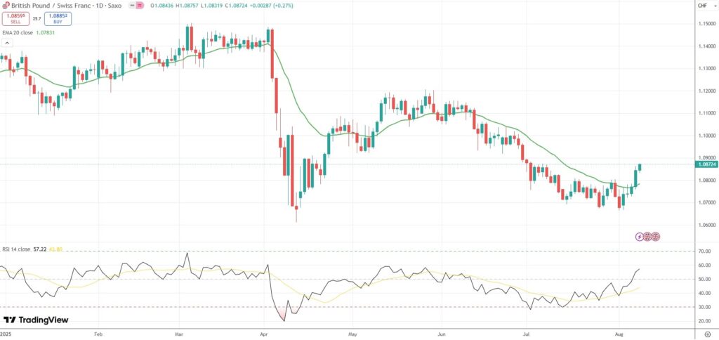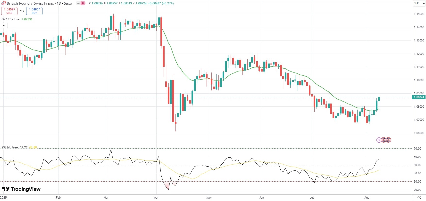The GBP/CHF currency pair settled 0.27% higher at 1.0872 on Friday.