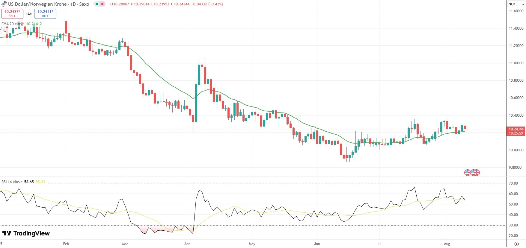 The USD/NOK currency pair was last down 0.42% on the day to trade at 10.2434.