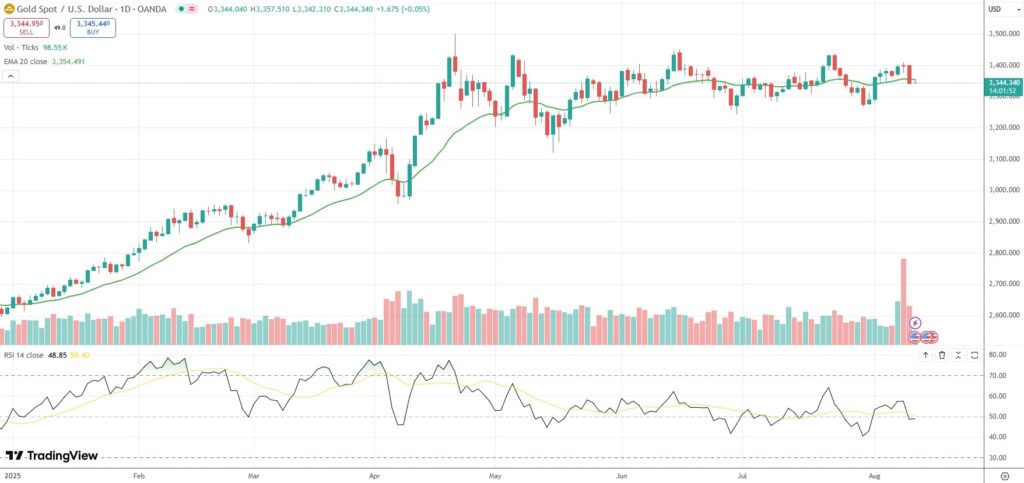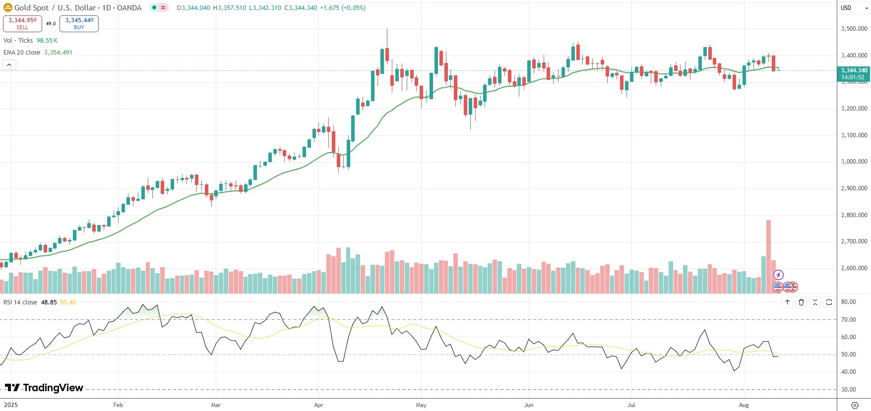 Spot Gold was last little changed on the day to trade at $3,344.34 per troy ounce.
